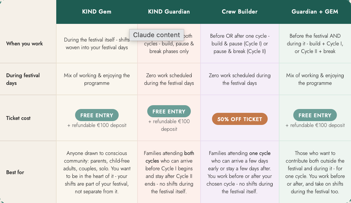 KIND Gems work shifts woven into the festival days (4h/day). You're fully part of the programme, mixing working and enjoying the gathering. A great fit for anyone who wants to contribute their energy while the village is fully alive around them - parents, child-free adults, couples, solo. Free entry.