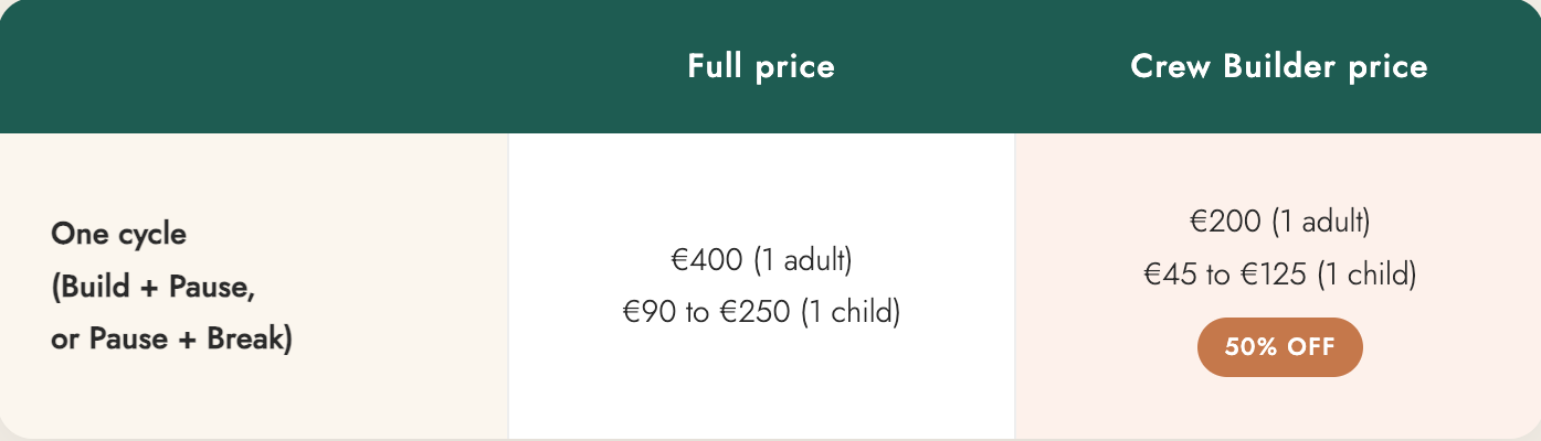 As a Crew Builder, you pay 50% off your own adult ticket, and children would come from 45€ to 125€ (depending on their age).