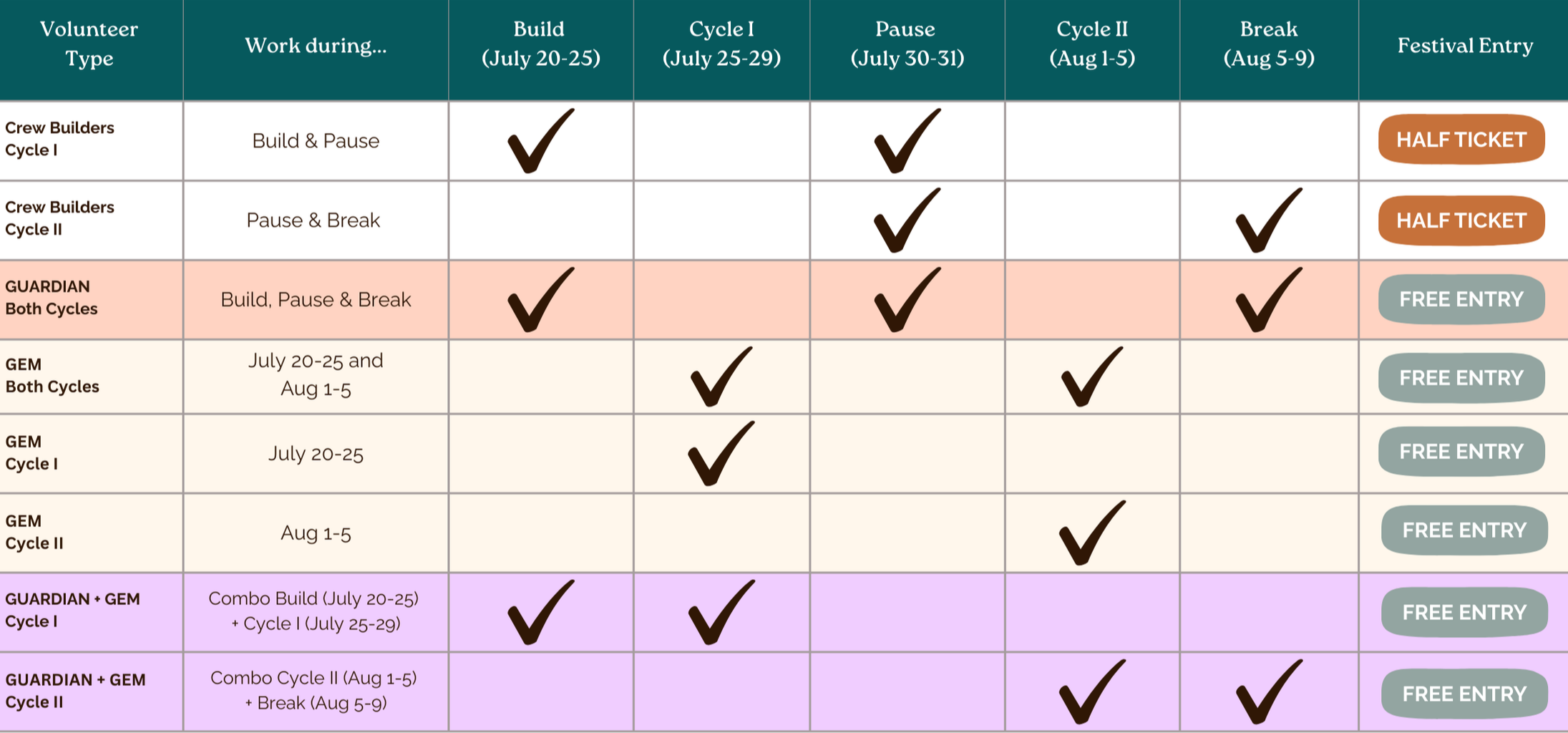 Guardian and Crew Builder mean you do all your work outside of the festival itself - so you experience your cycle or cycles with zero shifts.